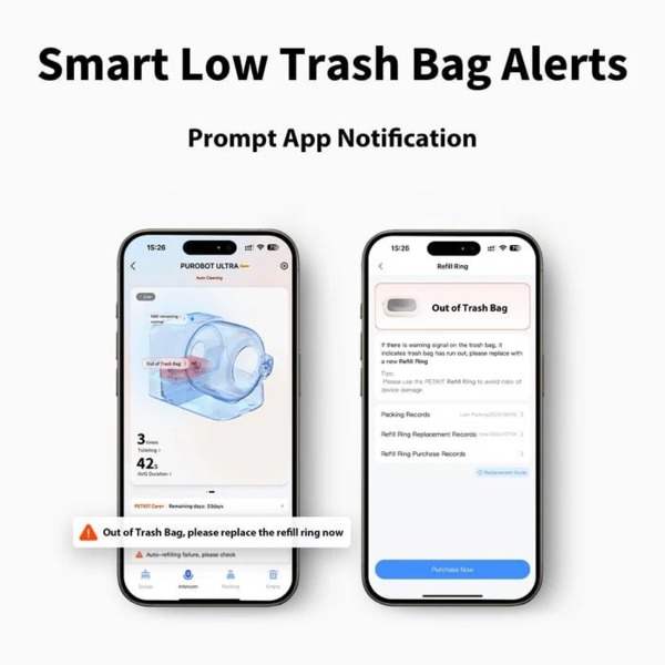 Інтегрований, елегантний і міцний. Ексклюзивне кільце для заправки Petkit може упаковувати приблизно 10 разів на штуку, а сміттєве відро може вмістити відходи однієї кішки протягом 20 днів. Дані були перевірені лабораторією Petkit на основі частоти відвідування туалету однією дорослою кішкою. Фактична частота може варіюватися в залежності від звичок вашої кішки у використанні туалету та конкретних потреб в упаковці.