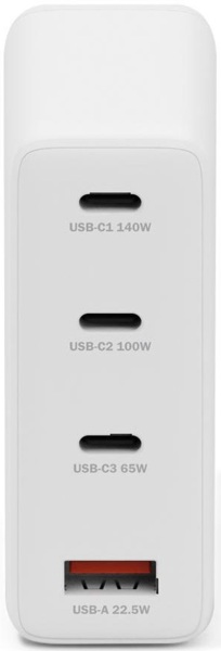 Зарядний пристрій GaN II потужністю 140 Вт із міцним кріпленням та чотирма портами — ідеальне рішення для сучасних робочих місць із високими енергетичними вимогами. Завдяки трьом портам USB-C (макс. 140 Вт, 100 Вт та 65 Вт) та одному порту USB-A (макс. 22,5 Вт) ви можете одночасно заряджати ноутбук, планшет, смартфон та інші пристрої. Загальна потужність становить до 130 Вт у режимі двох портів, до 115 Вт у режимі трьох портів і до 110 Вт при повному завантаженні всіх портів. У офісі, домашньому офісі, коворкінгу чи університеті: зарядний пристрій USB потужністю 140 Вт — ідеальне рішення, якщо ви хочете заряджати кілька пристроїв одночасно, безпечно та ефективно в професійному середовищі. Навіть два ноутбуки — це не проблема. Завдяки практичній підставці зарядний пристрій можна розмістити на столі, щоб заощадити простір. Сучасна технологія GaN II (нітрид галію) забезпечує високу ефективність, компактний дизайн та надійні результати заряджання. Виготовлений із 30% переробленого матеріалу PCR (постспоживча переробка) та упакований без використання пластику, пристрій поєднує технологічні характеристики з екологічністю. При цьому не робиться жодних компромісів щодо продуктивності чи довговічності. Універсальний для смартфонів, планшетів, ноутбуків та інших USB-пристроїв — зарядний пристрій GaN II потужністю 140 Вт є розумним рішенням, якщо ви хочете отримати максимальну продуктивність, інтелектуальні технології та екологічність в одному пристрої.