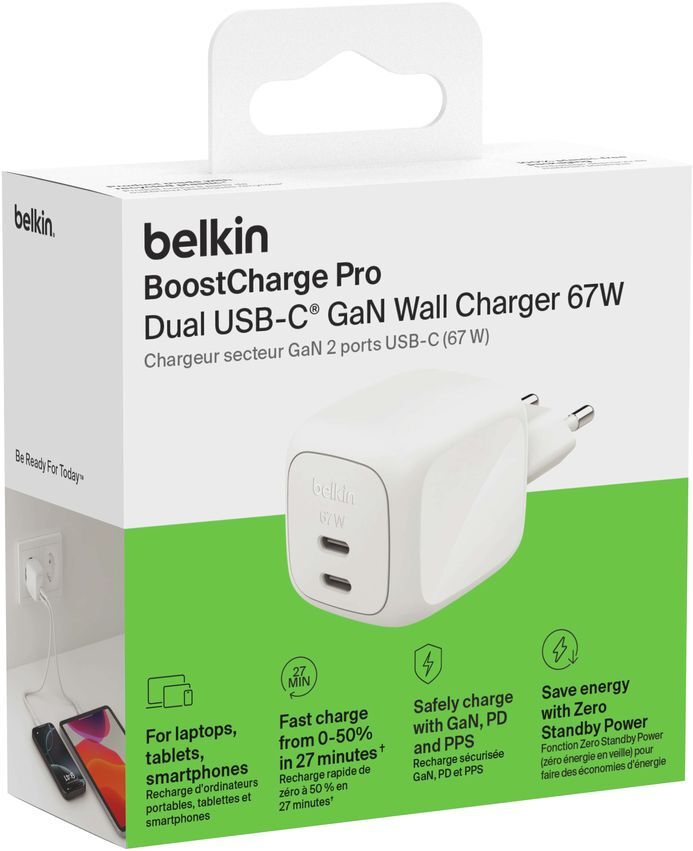 - Зарядний пристрій мережевий Belkin 67Вт 2хUSB-С GAN PD PPS, White
