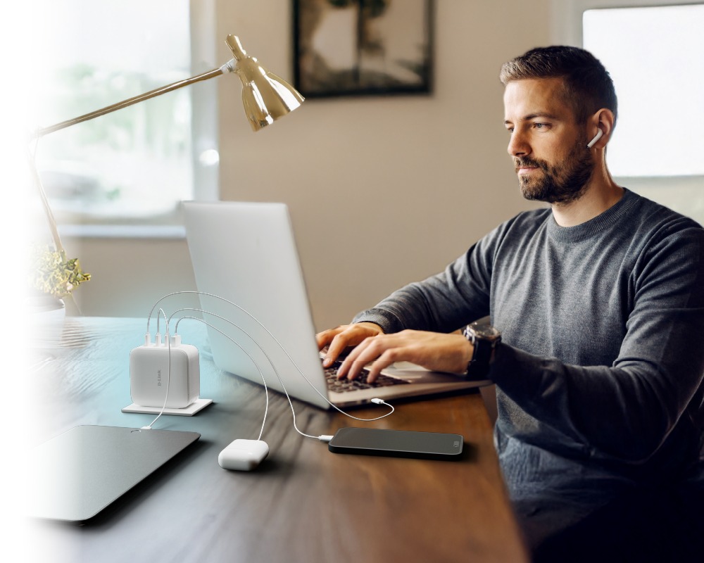 Зарядний пристрій DCF-141 заряджає ваш ноутбук, мобільний телефон, планшет і навушники одночасно через три порти USB-C і один порт USB-A. Більше не потрібно жонглювати адаптерами чи розетками; лише швидке та ефективне заряджання в одному елегантному рішенні для чистого та продуктивного робочого місця вдома.