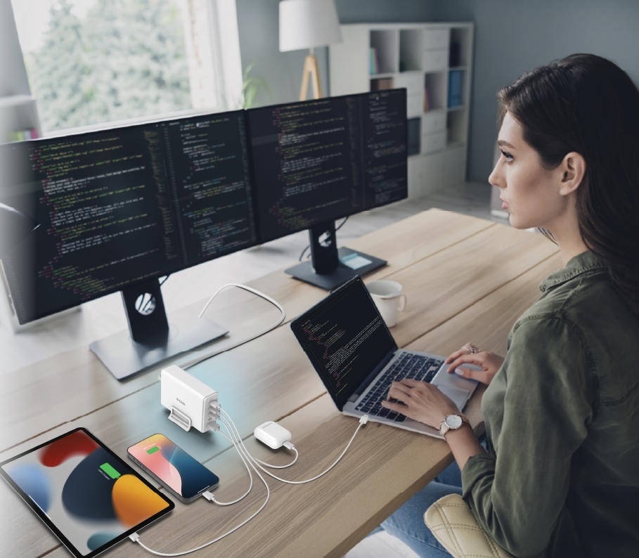 Працюєте вдома з кількома пристроями? Зарядний пристрій DCF-241 240 Вт GaN забезпечує швидке та надійне заряджання вашого ноутбука, мобільного телефону, планшета та інших пристроїв одночасно. Завдяки п'яти зарядним портам і компактному тримачу на підставці він впорядковує ваш робочий простір, усуває безлад у кабелях і забезпечує безперебійну роботу від початку до кінця робочого дня.