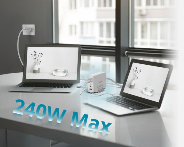 Зарядний пристрій DCF-241 потужністю 240 Вт забезпечує швидке та ефективне заряджання до п'яти пристроїв одночасно, включаючи два ноутбуки, а також планшет, мобільний телефон тощо через чотири порти USB-C та один порт USB-A. Завдяки вдосконаленому захисту та технології GaN він гарантує безпечне та надійне живлення. Компактна підставка-тримач зберігає робочий простір чистим, що робить його ідеальним для продуктивної роботи без безладу на робочому столі.