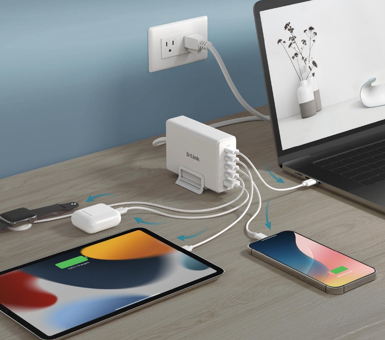 Зарядний пристрій D-Link DCF-241 забезпечує надшвидку зарядку потужністю до 240 Вт, що ідеально підходить для заряджання двох ноутбуків, планшетів, мобільних телефонів та інших пристроїв одночасно. Завдяки чотирьом портам USB-C і одному порту USB-A він забезпечує ефективну роботу всього вашого обладнання, зменшуючи безлад, що робить його ідеальним хабом живлення для домашнього робочого простору.