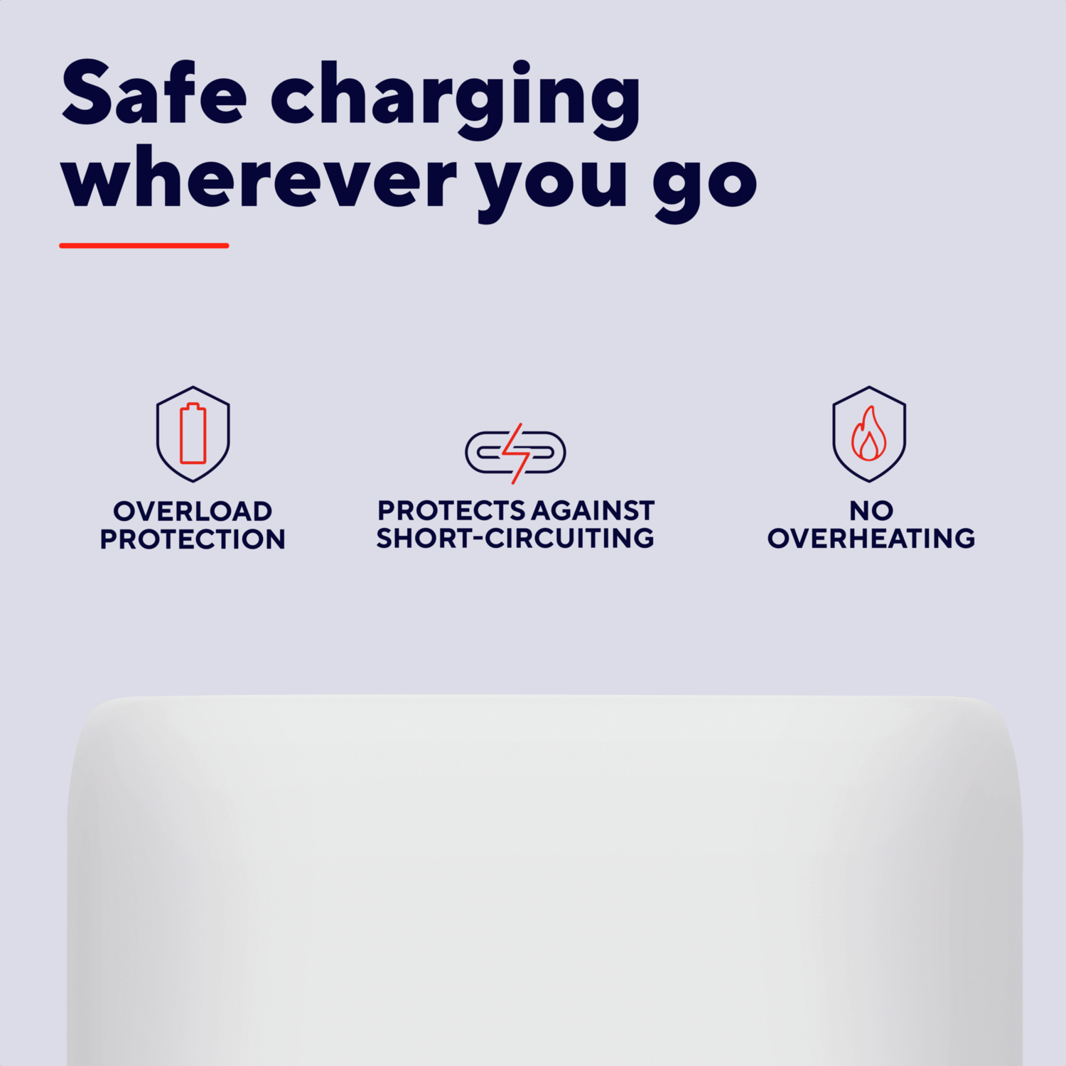 - Ідеальний зарядний пристрій для подорожей: працює з розетками будь-якої напруги по всьому світу (90–240 В змінного струму, 60/50 Гц).
