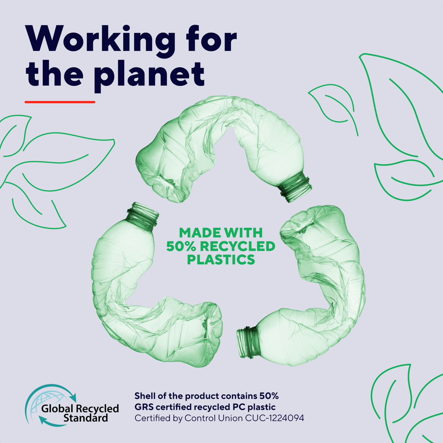 - Сталий дизайн, виготовлений з 50% переробленого пластику для зменшення впливу на довкілля.