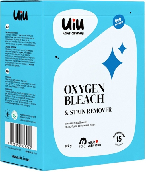Засіб для виведення плям UIU Кисневий відбілювач — пральний концентрований безфосфатний порошок для відбілювання та активації машинного та ручного прання виробів з бавовняних, лляних, синтетичних, штучних тканин, а також тканин зі змішаних волокон.