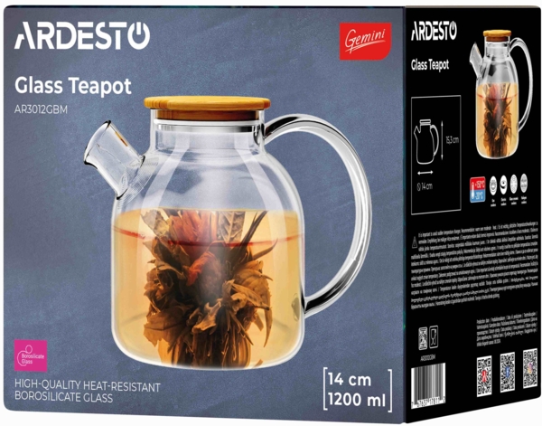 Заварник Ardesto Gemini – елегантний аксесуар для любителів чаю, який виготовлено з термостійкого боросилікатного скла. Він є втіленням елегантності та практичності, тоді як бамбукова кришка додає природного шарму. Об’єм – 1200 мл, прозорий дизайн надає змогу насолоджуватись процесом заварювання, а завдяки максимальному діаметру 14 см і висоті 15,3 см забезпечено зручність використання.
