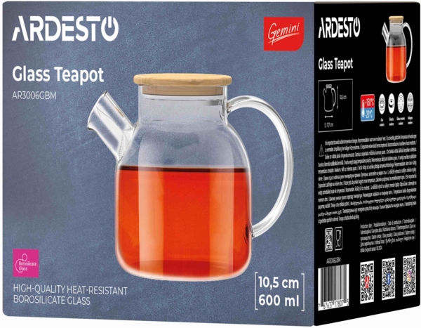 Заварник Ardesto Gemini – елегантний аксесуар для любителів чаю, який виготовлено з термостійкого боросилікатного скла. Він є втіленням елегантності та практичності, тоді як бамбукова кришка додає природного шарму. Об’єм – 600 мл, прозорий дизайн надає змогу насолоджуватись процесом заварювання, а завдяки максимальному діаметру 11,7 см і висоті 10,5 см забезпечено зручність використання.