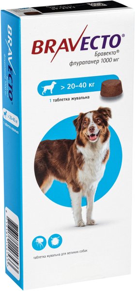 - Жувальна таблетка Bravecto від бліх та кліщів для собак вагою від 20 до 40 кг