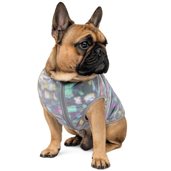 Надзвичайно легкий жилет с принтом тай-дай та металевим напиленням. Особливість моделі - застібка-блискавка на грудях.