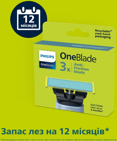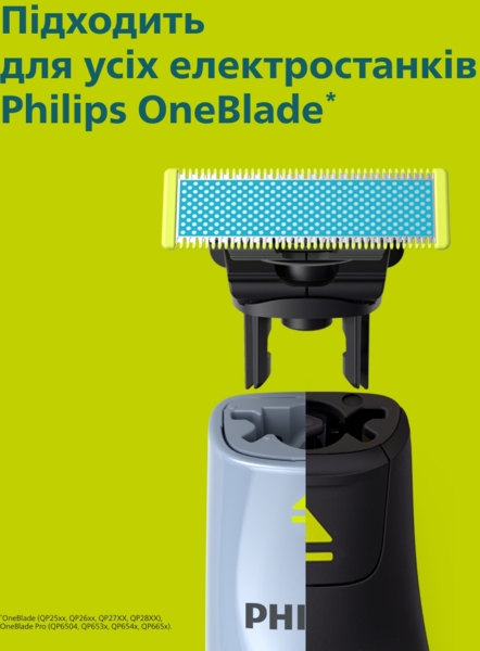 | Сумісність з моделями | Philips OneBlade QP27хх, Philips OneBlade QP28хх, Philips OneBlade Pro QP6504, Philips OneBlade Pro QP653x, Philips OneBlade Pro QP654x, Philips OneBlade Pro QP665x, Philips OneBlade QP13xx, Philips OneBlade QP14xx, Philips OneBlade QP25xx, Philips OneBlade QP26xx |
