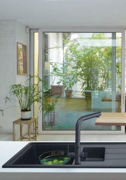 Важіль відкривається вперед на кут 90°, що дозволяє здійснювати монтаж впритул до стіни, економлячи простір на кухні та забезпечуючи естетичний вигляд.