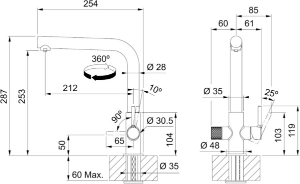 Кут повороту виливу складає 360°, завдяки чому водяний потік досягає більшої площі мийки, а також такий змішувач можна монтувати в острівні кухні, забезпечуючи неперевершену гнучкість у використанні.