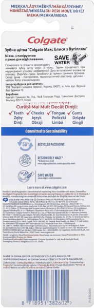 Colgate Max White Charcoal — це відбілююча мануальна щітка, розроблена для видалення плям з поверхні емалі та відновлення природної білизни зубів.