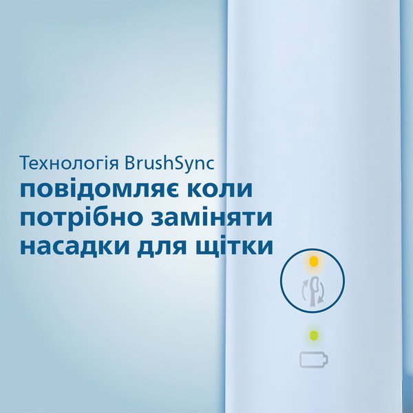 Із часом усі насадки для щітки зношуються. Проте наша технологія BrushSync відстежує тривалість використання насадки для щітки та інтенсивність чищення. Коли настане час замінити її, індикатор на ручці та короткий звуковий сигнал повідомлять Вас про це. Це забезпечує належну роботу насадки для щітки.