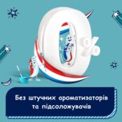 | Склад | Aqua, Hydrated Silica, Sorbitol, Glycerin, Sodium Lauryl Sulfate, Xanthan Gum, Aroma, Titanium Dioxide, Carrageenan, PEG-6, Sodium Saccharin, Sodium Fluoride, Limonece, CI 73360, CI 74160, містить натрій фторид 0,315% w/w (1450 ppm фтору) |