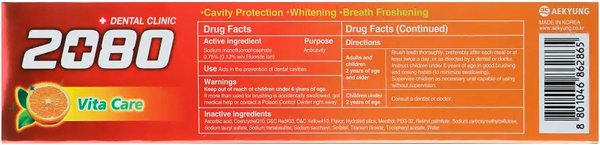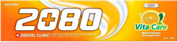 Зубна паста Dental Clinic 2080 Vita Care видаляє залишки їжі з міжзубного простору, перешкоджає утворенню нальоту і зубного каменю, покращує загальний стан ротової порожнини. Має антисептичні властивості, пригнічує діяльність патогенної мікрофлори, відновлює пошкоджені клітини, робить зуби міцнішими, стійкішими до кислого середовища. Підвищує імунітет тканин, позитивно впливає на обмінні процеси, загоює мікротріщини та міні рани, бореться з кровоточивістю та чутливістю ясен. Регулярне використання засобу забезпечує надійний захист від карієсу та гінгівіту.
