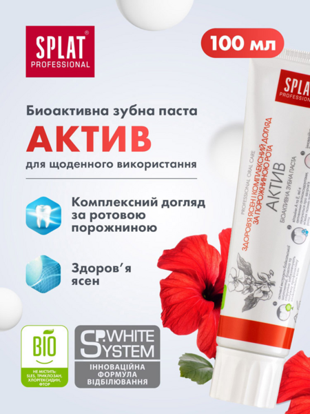 У вас коли-небудь була зубна паста чорного кольору? Саме таку представляє вашій увазі бренд Splat. Цей засіб містить активні рослинні екстракти, які попереджають і знімають запалення та перешкоджають кровоточивості ясен. Їх загоєння відбувається завдяки присутності в пасті вітамінного комплексу. Завдяки такій потужній дії, продукт використовується для превенції пародонтиту. Паста також насичена системою Sp. White System, завдяки якій ваша емаль відполірується і зміцниться, а зубки стануть значно білішими. Надійний захист від карієсу, запалень ясен, міцні та здорові зуби - все завдяки засобу "Актив" з іонами кальцію та цінними екстрактами лікарських рослин.