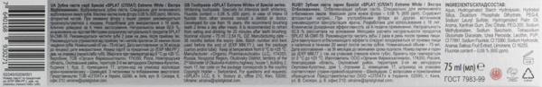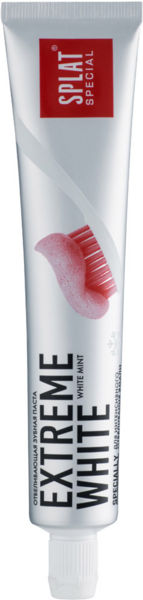 Всі інноваційні та унікальні зубні пасти серії Special були створені в науковій лабораторії Splat для активних і сучасних людей, які не бояться експериментувати, живуть яскраво і піклуються про своє здоров'я. Емоційна серія унікальних продуктів, кожен з яких створений з урахуванням ідей і побажань наших покупців. Зубні пасти цієї серії мають багатий склад, насичений ексклюзивними компонентами. Якщо ви перебуваєте в пошуках по-справжньому ефективної відбілювальної зубної пасти, тоді неодмінно зверніть увагу на пасту Extreme White від компанії Splat Special. Чудова зубна паста має виражену відбілювальну дію, стане вашим надійним помічником не тільки в якісній підтримці гігієни порожнини рота, а й у створенні самої променистої та білосніжної посмішки!