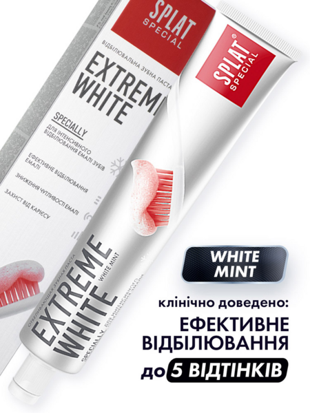 - Інноваційна відбілювальна зубна паста Extreme White містить мікрогранули з пероксидом карбаміду та унікальний відбілювальний комплекс Sp. White system. Паста створена спеціально для м'якого відбілювання емалі протягом 4 тижнів щоденного застосування.