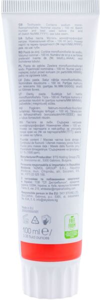 | Склад | Hydrogenated starch hydrolysate, aqua, hydrated silica, PEG-8, sodium coco-sulfate, cellulose gum, aroma, sodium monofluorophosphate, bergenia crassifolia leaf extract, xanthan gum, PVP, sodium methylparaben, calcium glycerophosphate, scutellaria baicalensis root extract, acacia seyal gum, sodium saccharin, spirulina platensis extract, papain, tocopheryl acetate, retinyl palmitate, helianthus annuus seed oil, mannitol, tocopherol, limonene |