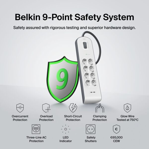 Belkin Surge Protection Strip обеспечивает безопасность подключенных устройств благодаря трехлинейной защите переменного тока. Этот тип защиты предохраняет от скачков напряжения, возникающих между горячей, нейтральной и заземленной линиями.