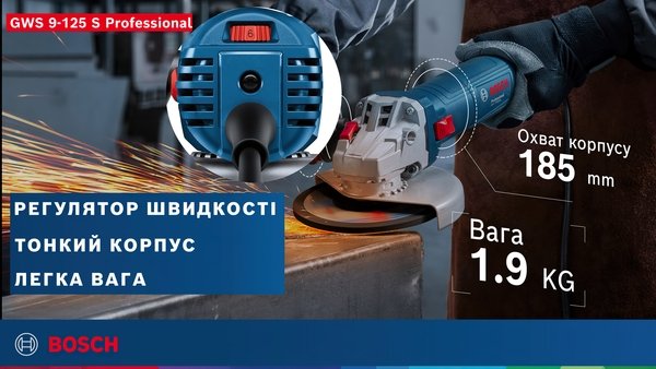 Углошлифовальная машина Bosch GWS 9-125 S Professional - легкий (1,9 кг), небольшой (280х73 мм) электроинструмент, работающий с дисками 125 мм, с уникальной зачищающей и режущей способностью. Мощность 900 Вт. Предварительная установка скорости (регулировка оборотов 2800-11000 об/мин) дает возможность работать со многими материалами.