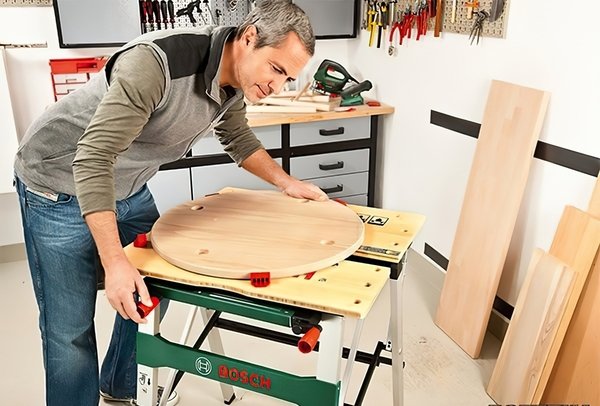Рабочая поверхность выполнена из дерева, достаточно прочного и хорошо отполированного. Мне нравится, что его с легкостью можно сложить, переместить, ведь мне часто приходится работать на даче. В Мойо на верстак БОСШ-600 была отличная скидка, купил и получил уже на следующий день. Товарищ посоветовал именно такую модель, очень функциональный. Сборка крепкая, не раскручивается, но бывает скрипит стойка при работе, пока не понял откуда этот звук. Стоит устойчиво, зажимы держатся все на местах. Заготовка уверенно фиксируется, так что техника безопасности у меня всегда соблюдается. Для домашних дел то что нужно, доволен приобретением. Есть встроенная полка, могу расположить нужные инструменты.