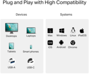 Просто подключите и используйте без каких-либо сложных действий на своем устройстве USB-C или USB-A, таком как настольные компьютеры, ноутбуки, телефоны и столы, которые поддерживают Mac OS, Windows, Linux OS, iPadOS, iOS, Android и Chrome OS.