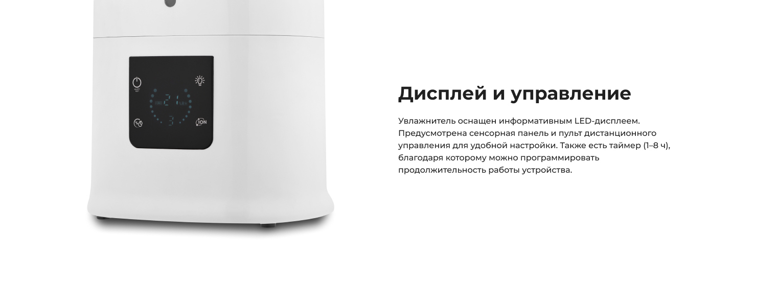 | Особенности, управление и индикация | Автоматическое выключение, Встроенный гигростат, Ночной режим, Подсветка, Пульт ДУ, Регулировка интенсивности испарения, Таймер |