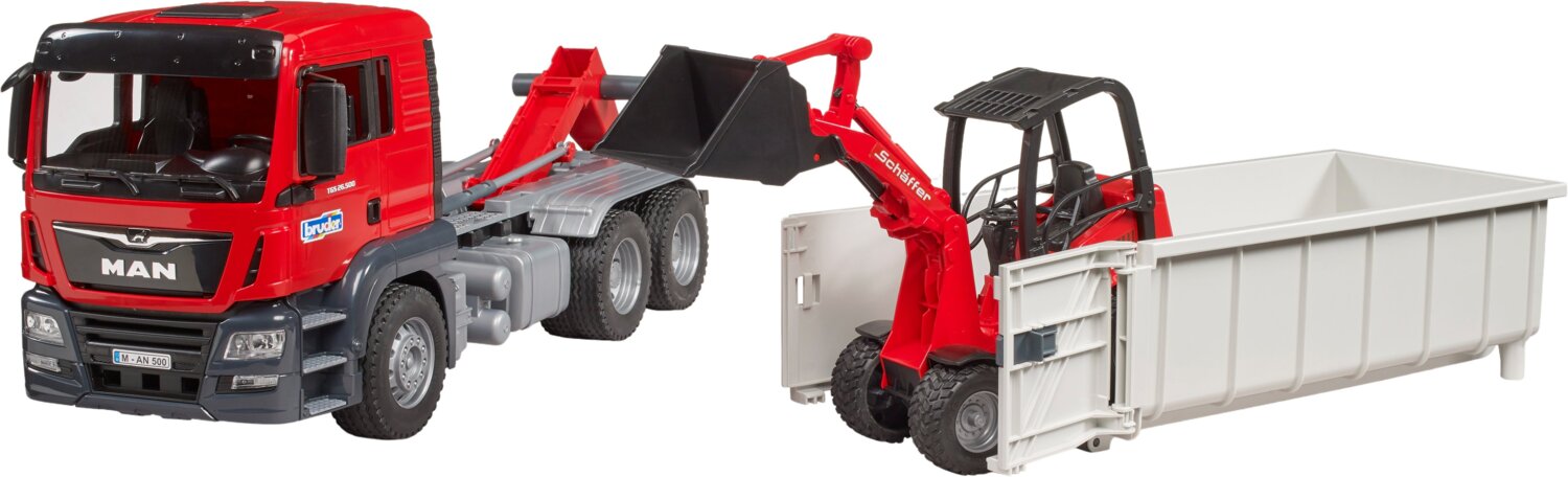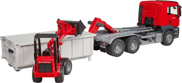 MAN TGS - идеальный выбор для строительства, дальних маршрутов и местной доставки. Кабина оснащена открывающимися дверями, обеспечивая любой фигурке bworld современное и удобное рабочее место. Контейнер можно поднимать и опускать. Меньшие модели могут заезжать внутрь и перевозиться грузовиком - точно так же, как это происходит в реальности. В комплект входит популярный погрузчик Schaeff.