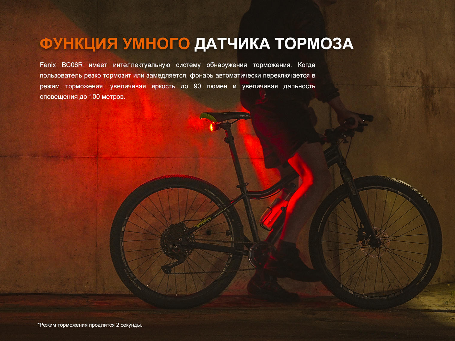 Велофара Fenix BC06R работает в 8 режимах и имеет функцию умного торможения, которая срабатывает при быстром снижении скорости езды, увеличивая яркость света до 90 лм. Широкоугольный луч света 270°, видимый на расстоянии 100 м, обеспечивает максимальную безопасность. Аккумулятор 560 мАч гарантирует до 22 ч непрерывного свечения на одном заряде. Модель можно крепить к дугам седла или подседельному штырю.