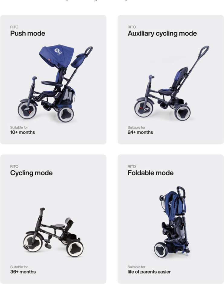 - Трехколесный велосипед QPlay Rito + Eva можно толкать и контролировать взрослыми до тех пор, пока ребенок не научится ездить. В жаркий солнечный день капюшон защищает ребенка, и при необходимости его можно легко демонтировать.