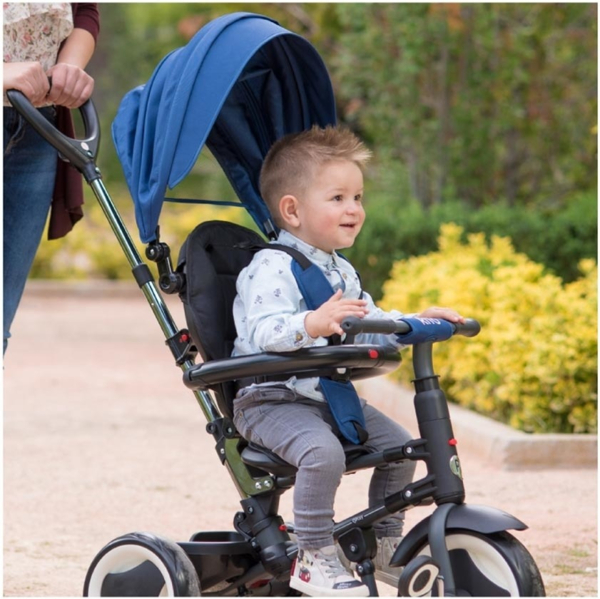 - Функциональный велосипед с мягким регулируемым сиденьем, большим защитным капюшоном, родительской ручкой и блокировкой педалей и руля.