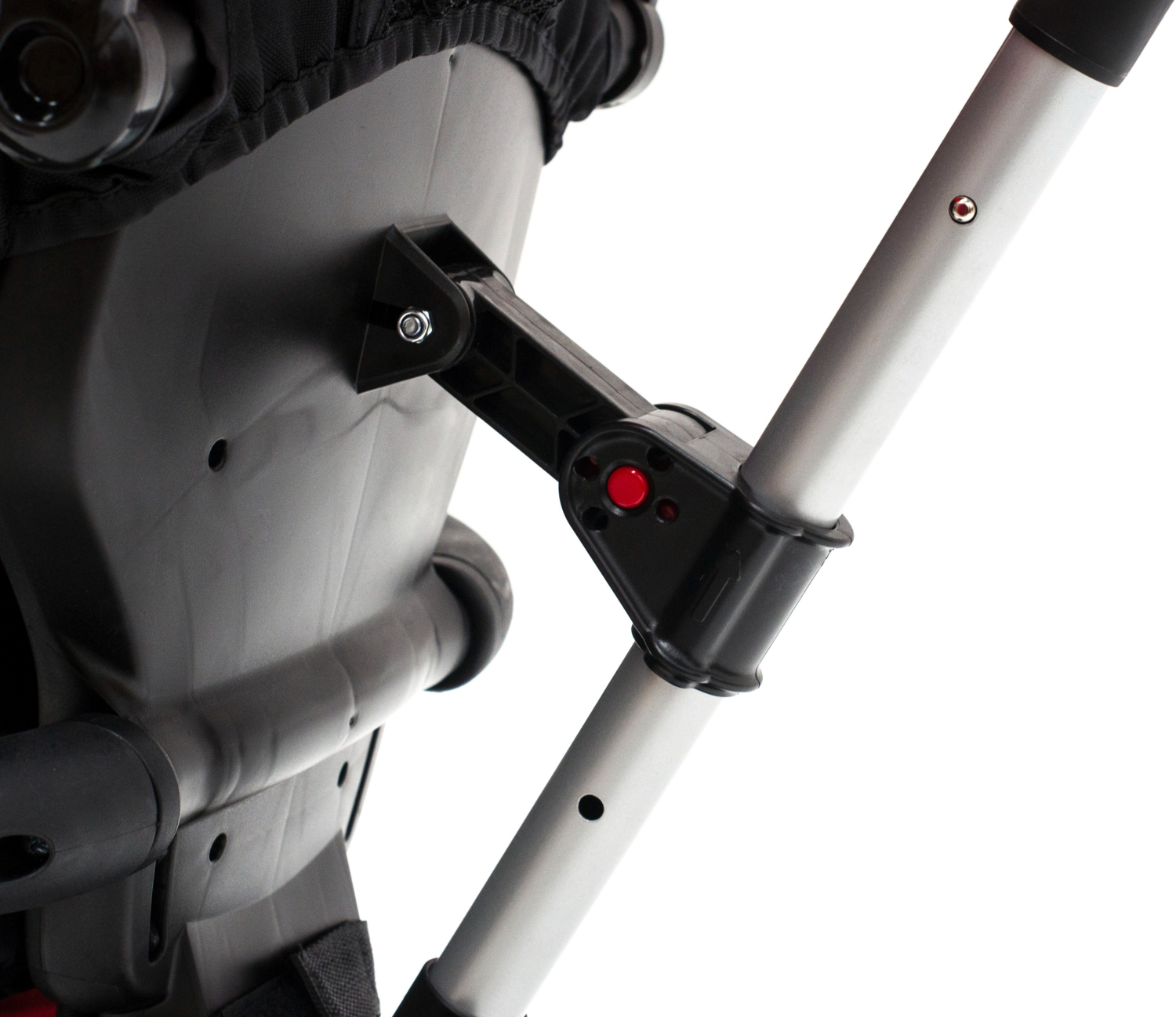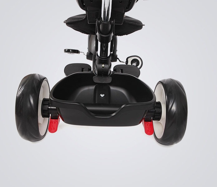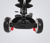 - Функциональный велосипед с мягким регулируемым сиденьем, большим защитным капюшоном, родительской ручкой и блокировкой педалей и руля.