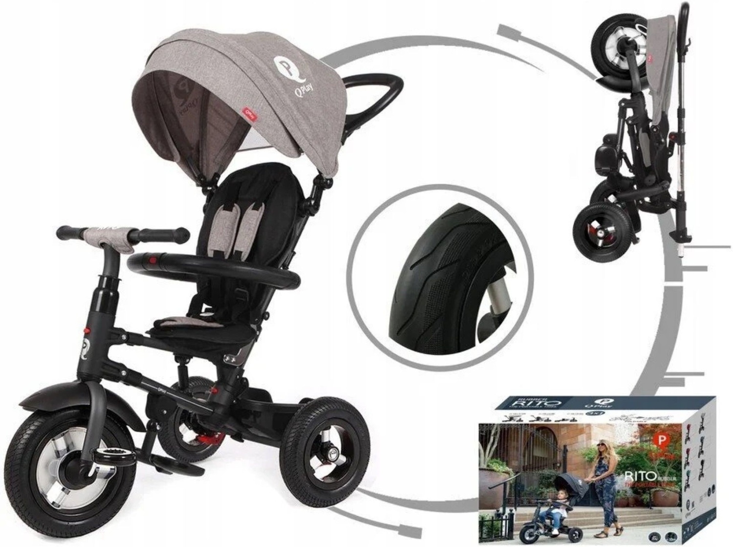 - Велосипед трехколесный QPLAY Rito Rubber складной, серый (S380-10GreyRubber)