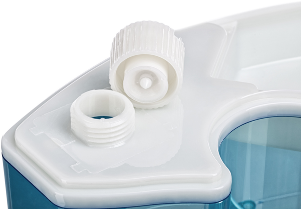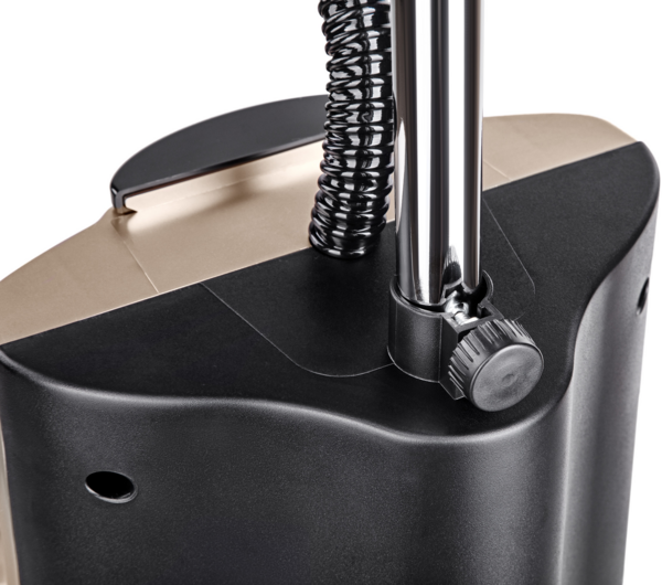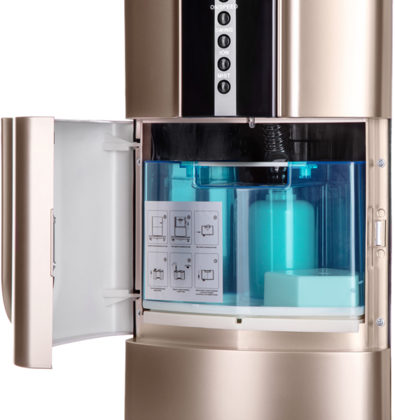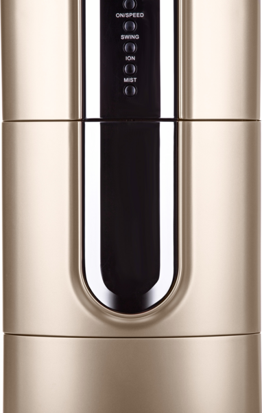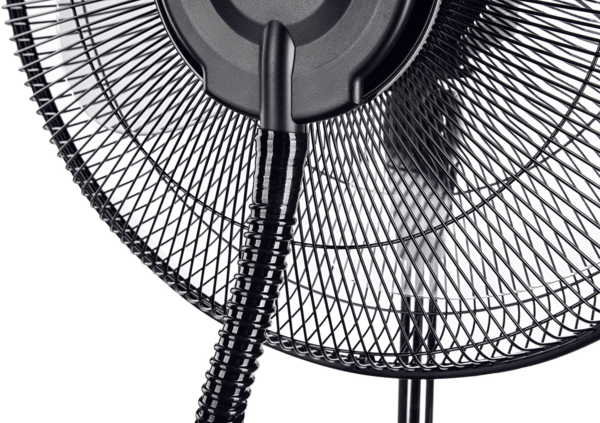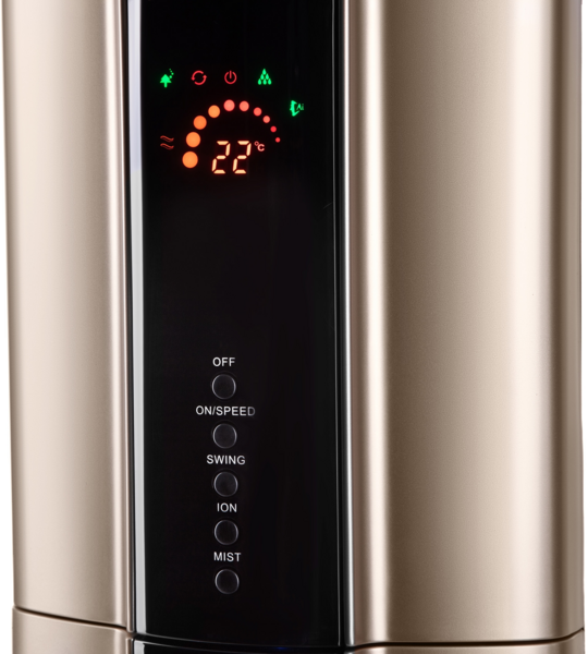 Электронное управление реализовано с помощью цифрового светодиодного экрана, для дистанционного управления есть пульт, который позволяет управлять доступными функциями вентилятора. Мощность вентилятора - 100 Вт, есть три скорости, таймер на 9 часов и три режима работы. Вращение обеспечивает равномерное распределение воздушных потоков в помещении. Особенностью модели является наличие функции увлажнения и подачи холодного пара, для чего предусмотрен конструкцией вентилятора резервуар для воды объемом 1,5 литра, расход воды при этом составляет 200 мл/час.