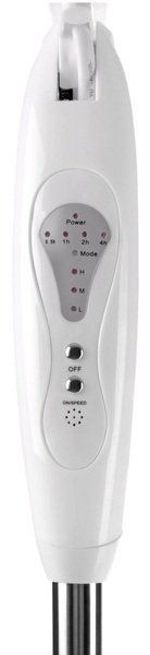 Механическое управление реализовано с помощью двух клавиш, для дистанционного управления есть пульт с четырьмя кнопками. Мощность вентилятора – 45 Вт, есть три скорости, таймер и два режима работы – постоянный и периодический. Функция вращение обеспечивает равномерное распределение воздушных потоков в помещении.