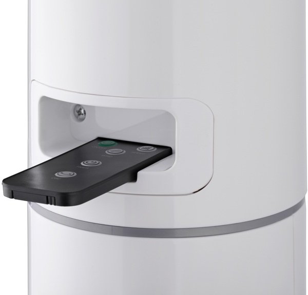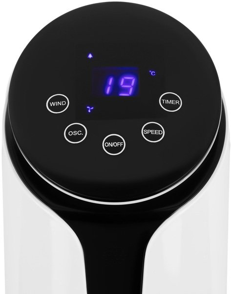 Вентилятор получил LED-дисплей, на котором отображается температура окружающей среды. На верхней части расположена панель управления, а для удобного хранения пульта ДУ предусмотрен специальный отсек. Среди настроек — три режима скорости, вращение, таймер до 15 часов, а также режим морского бриза.