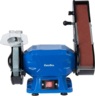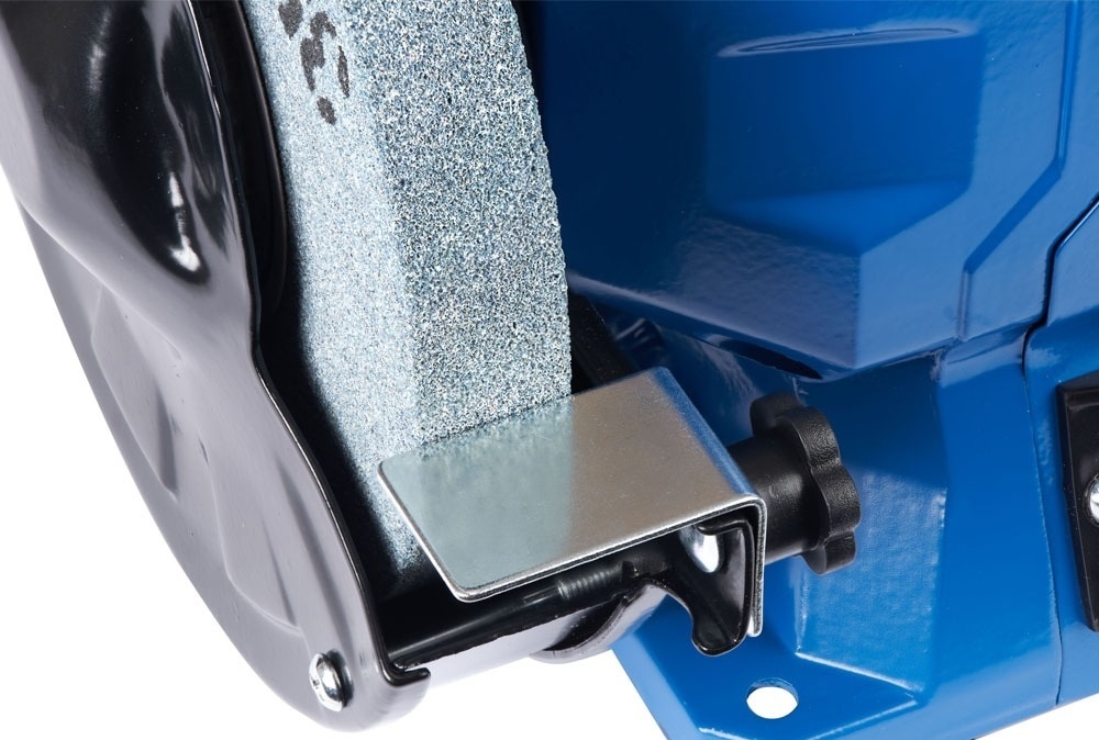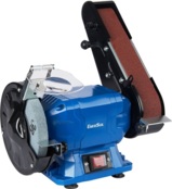 Комбинированный точильный станок 2 в 1 сочетает в себе абразивный круг и шлифовальную ленту, что делает его универсальным для заточки инструмента, шлифования плоских поверхностей и зачистки деталей.