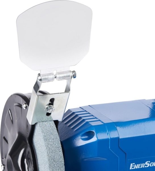 Станок имеет регулируемый защитный экран, который повышает безопасность работы, защищая глаза пользователя от искр и мелких осколков.