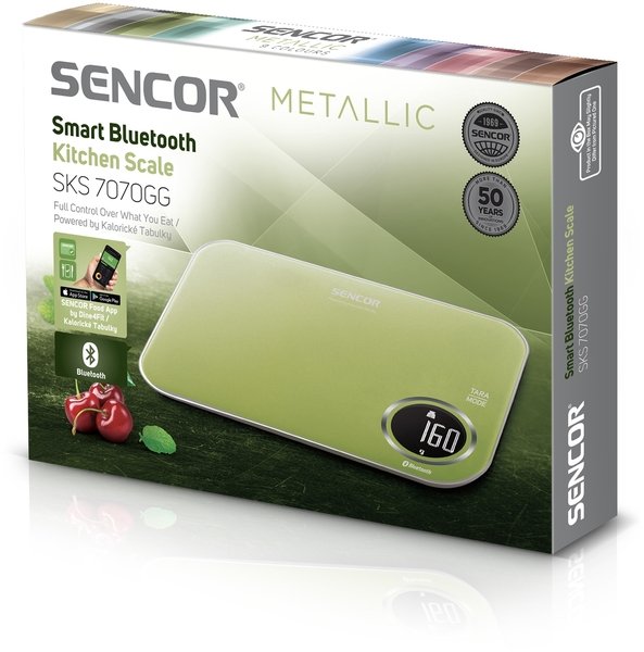 Весы оснащены беспроводной технологией Bluetooth, которая вместе с приложением Sencor Food, установленным на вашем смарт-устройстве, обеспечивает прямой доступ к обширной и регулярно обновляемой базе данных ингредиентов и их питательной ценности.