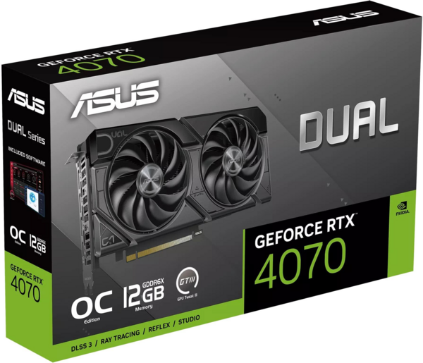Видеокарта ASUS Dual GeForce RTX 4070 EVO сочетает в себе отличные температурные характеристики и широкую совместимость. Современные решения для охлаждения уровня флагманских видеокарт, в частности два вентилятора Axial-tech, направляющие максимальный поток воздуха к радиатору, размещены в корпусе длиной 22,7 см и толщиной 2,5 слота. Эти усовершенствования делают видеокарты серии ASUS Dual идеальным выбором для геймеров, которым нужна высокая графическая мощность в компактном корпусе.