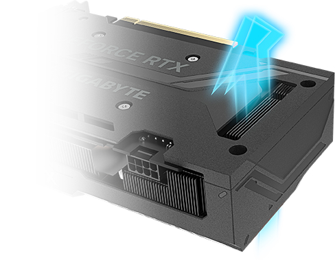 Система охлаждения WINDFORCE включает два 90-мм вентилятора с уникальными лопастями, вращающиеся попеременно, 3 композитные медные тепловые трубки, непосредственно соприкасающиеся с GPU, 3D-активные вентиляторы и охлаждение экрана, которые вместе обеспечивают высокоэффективное рассеивание тепла.