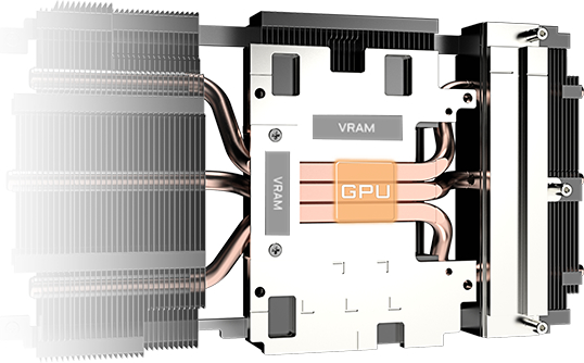 Форма медной тепловой трубки максимально увеличивает площадь прямого контакта с графическим процессором. Тепловая трубка также охватывает VRAM через большую металлическую пластину для обеспечения надлежащего охлаждения.