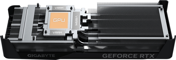 Большая медная пластина непосредственно соприкасается с GPU и соединяется с композитными медными тепловодными трубками, которые быстро передают тепло от GPU и VRAM к радиатору.