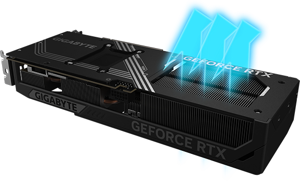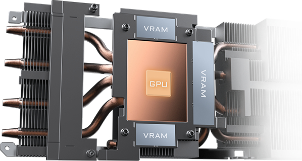 Большая медная пластина непосредственно контактирует с GPU, а составные медные тепловые трубки быстро передают тепло GPU и VRAM на радиатор.