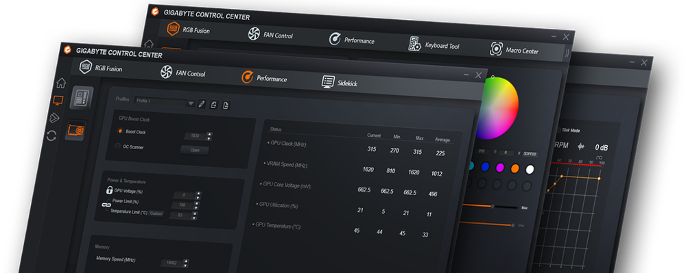GIGABYTE CONTROL CENTER (GCC) - это единое программное обеспечение для всех поддерживаемых GIGABYTE продуктов. Оно обладает интуитивно понятным интерфейсом, позволяющим пользователям в режиме реального времени регулировать тактовую частоту, напряжение, режим работы вентилятора и целевое энергопотребление.