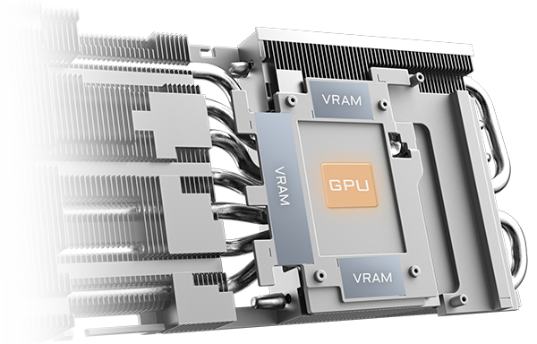 Большая медная пластина непосредственно контактирует с GPU, а составные медные тепловые трубки быстро передают тепло GPU и VRAM на радиатор.