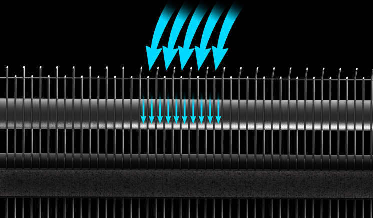 Большая паровая камера непосредственно соприкасается с графическим процессором и в сочетании с усовершенствованными композитными медными тепловыми трубками быстро отводит тепло от графического процессора и видеопамяти к радиатору.
